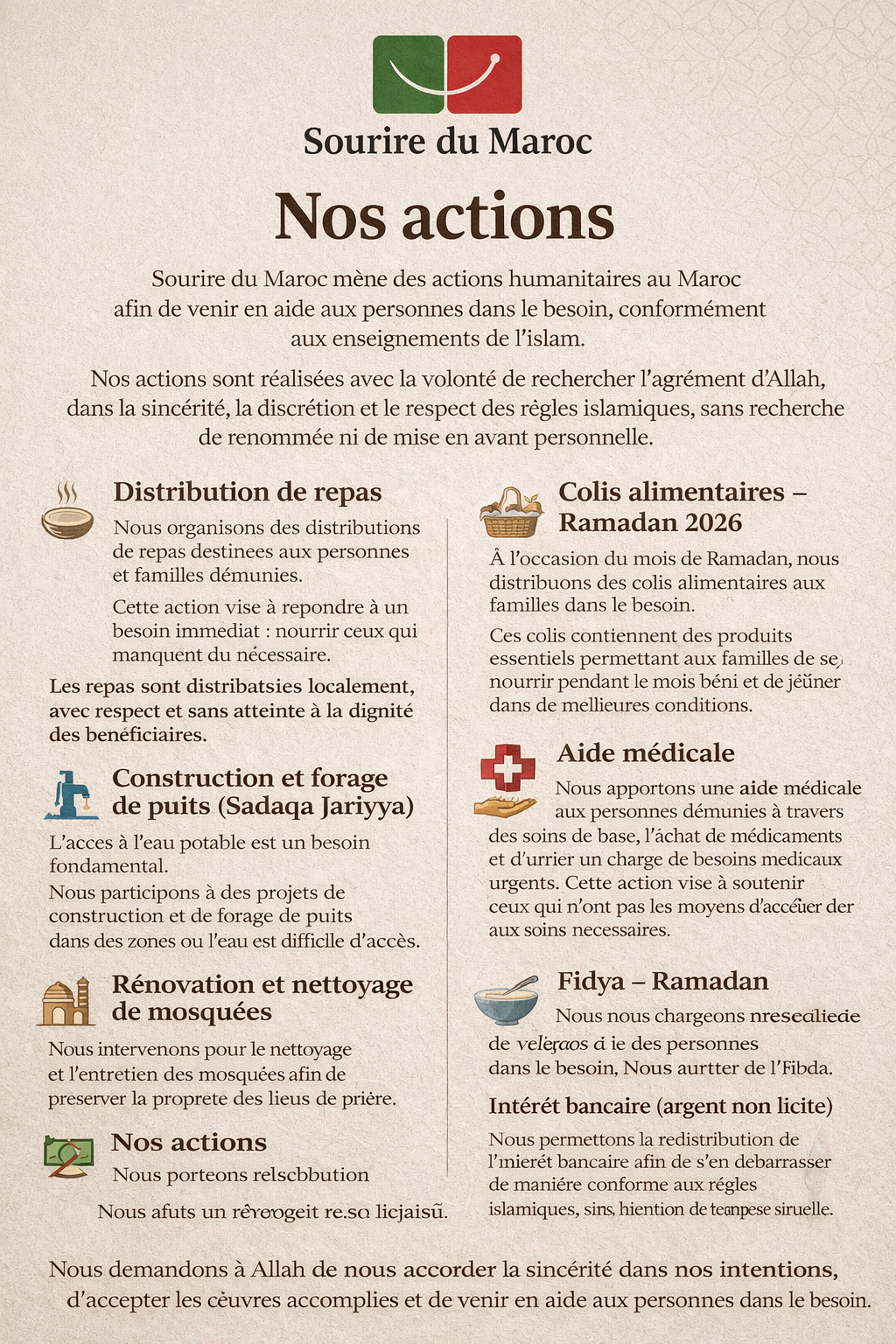 Nos actions sont réalisées avec la volonté de rechercher l’agrément d’Allah, dans la sincérité, la discrétion et le respect des règles islamiques, sans recherche de renommée ni de mise en avant personnelle.